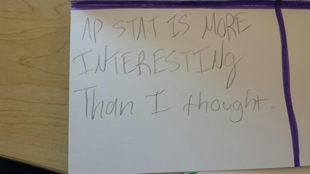 Today was a good day filled with writing activities. In Stat we did an AP problem, then set up our notebooks. In AVID, we watched a summer speaker video and did a learning log. I'm eager to read their papers tomorrow!